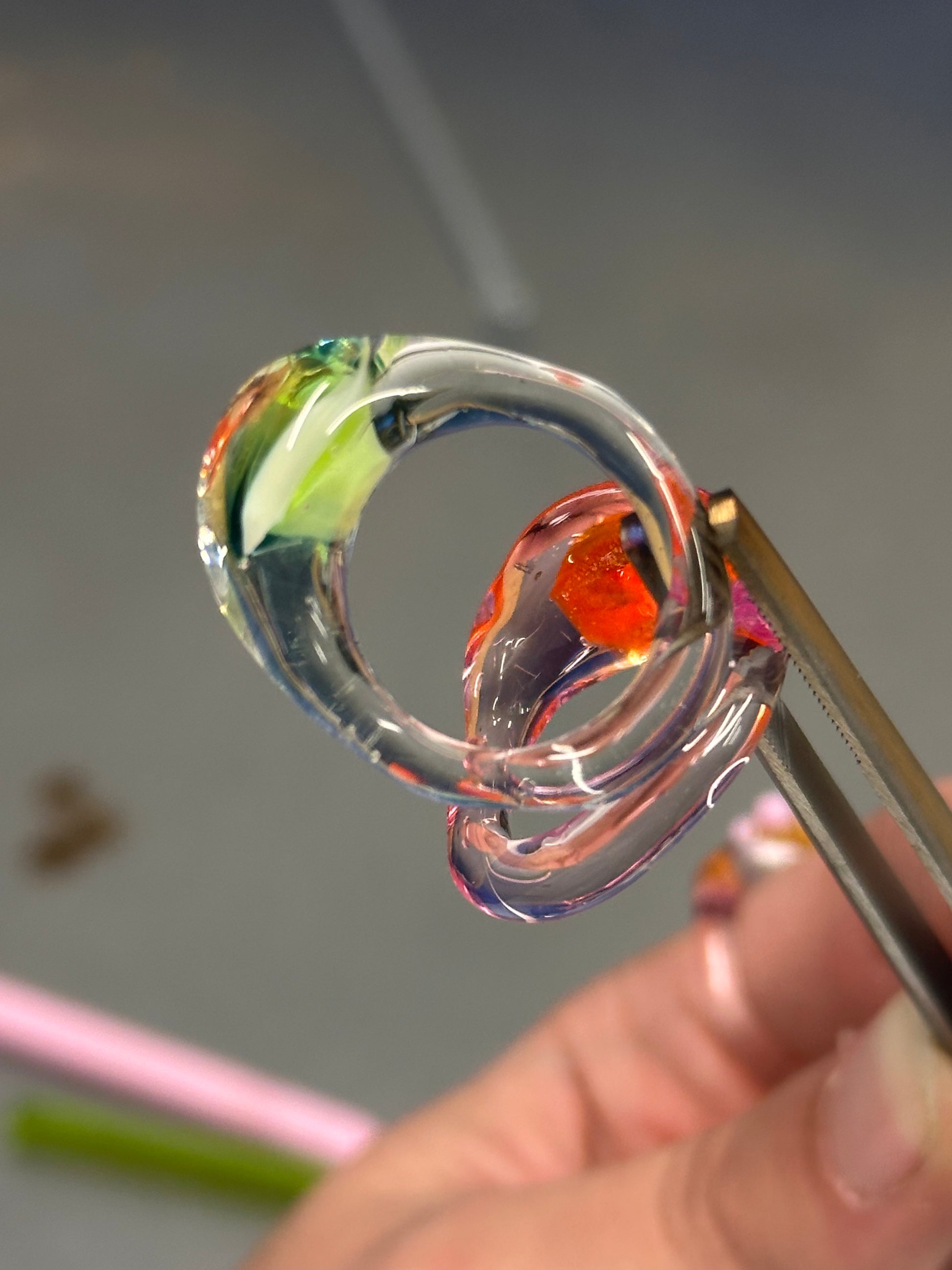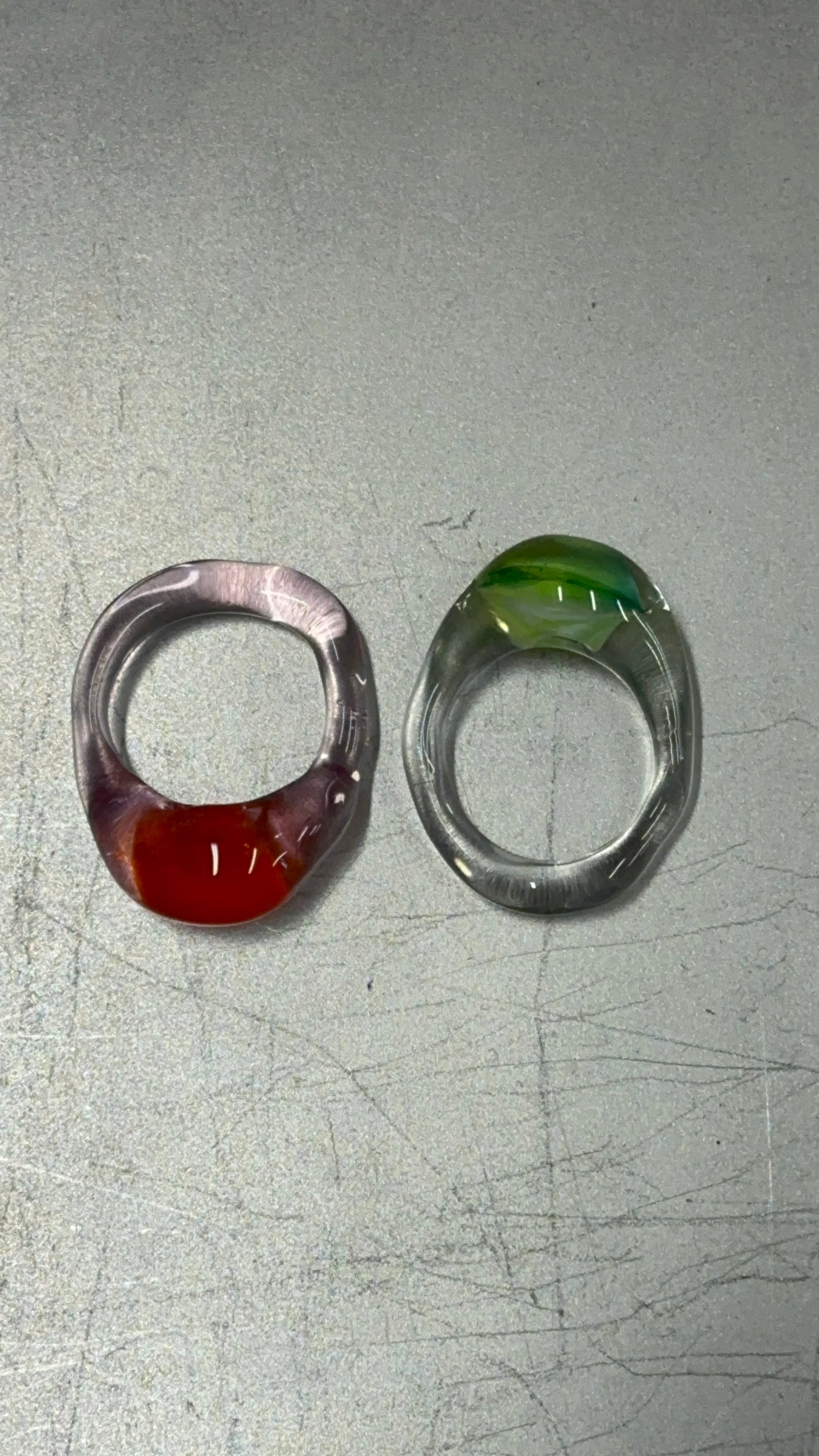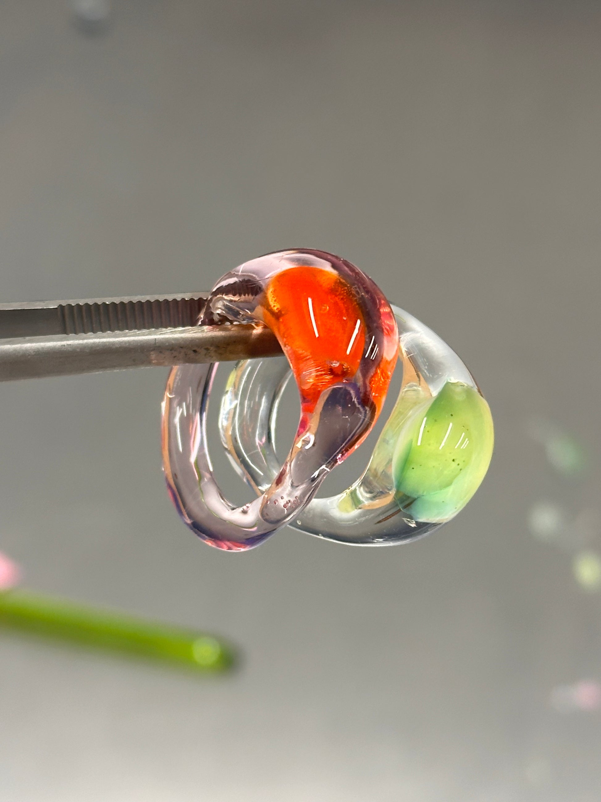 Anillo hecho a mano con vidrio de borosilicato, un material resistente, ligero y con una transparencia preciosa.