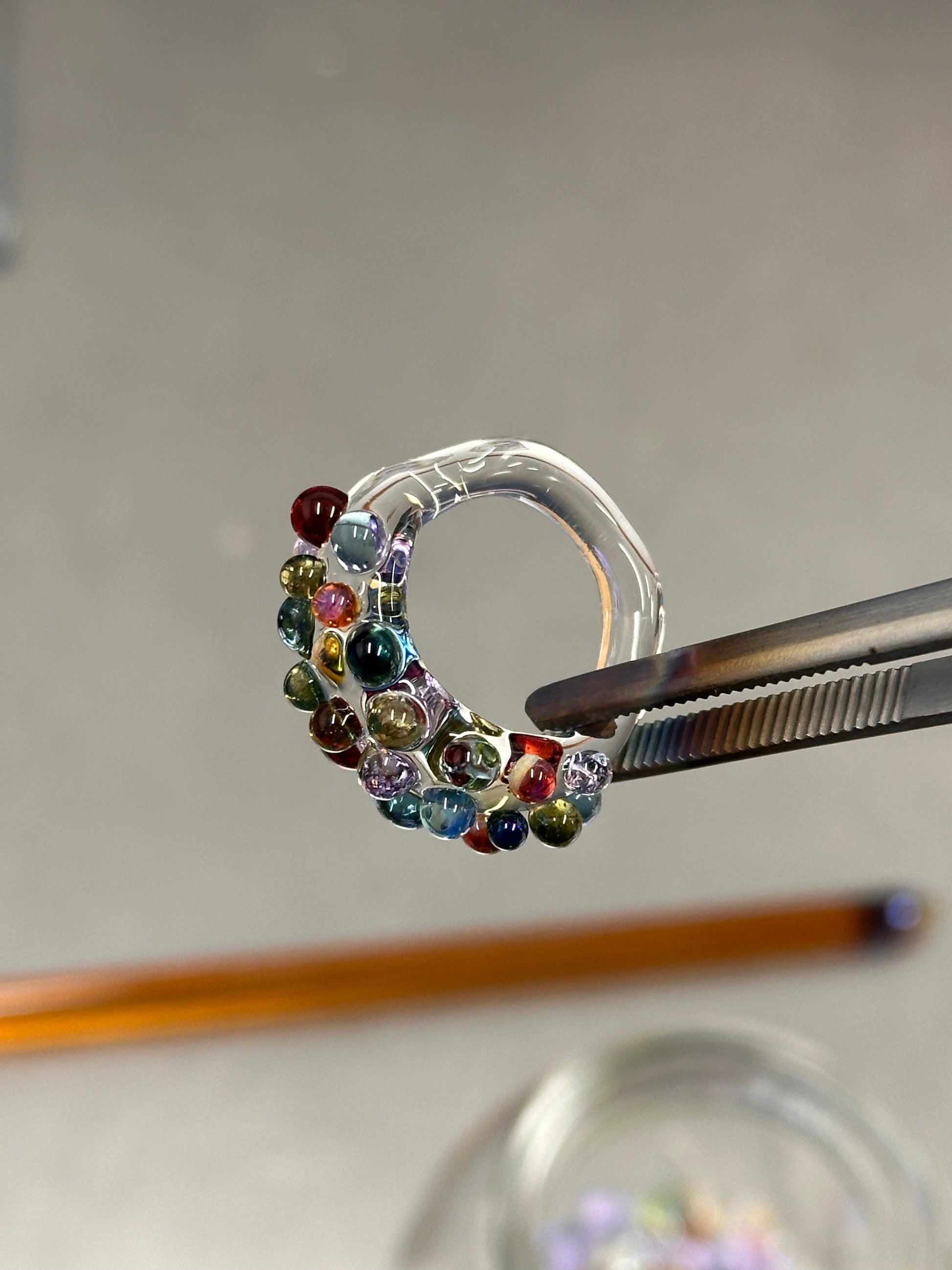 Anillo hecho a mano con vidrio de borosilicato, un material resistente, ligero y con una transparencia preciosa.